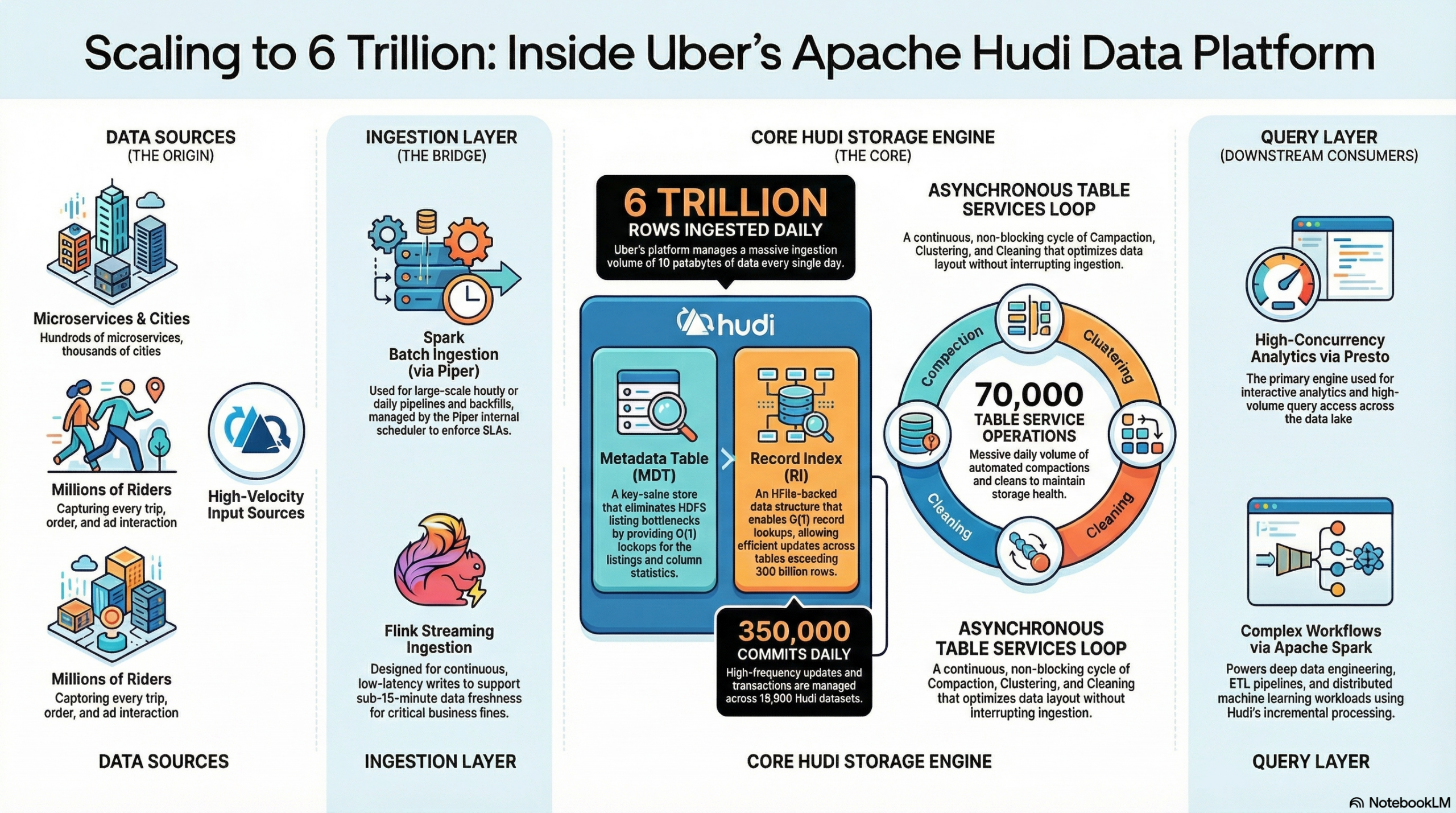 Uber’s journey with Hudi proves that at trillion-record scale, you cannot treat the data lake as passive file storage. By building a disciplined operational ecosystem around ACID transactions and high-performance indexing, Uber has bridged the gap between streaming runtimes and massive-scale storage.
